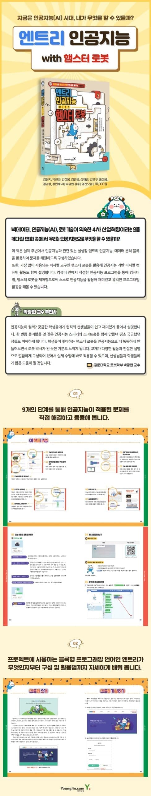 『엔트리 인공지능 with 햄스터 로봇』은 스스로 인공지능을 활용해 재미있고 유익한 프로그래밍 활동을 할 수 있도록 도와준다. “외국인과 대화를 돕는 AI 통번역기”, “계절별 선호 음악 장르를 알려주는 챗봇”, “이미지 모델 학습을 통해 분리수거를 하는 AI 햄스터 로봇” 등 인공지능과 관련된 실생활 문제를 제시하고 블록형 프로그래밍 언어인 엔트리에서 제공하는 인공지능 블록을 이용해 문제를 해결해 본다. 문제당 9개의 단계를 거치면서 인공지능 프로그래밍 시작부터 문제 해결, 그리고 심화 활동을 통한 응용 학습까지 친절하게 설명한다. 나아가 책에서 설명한 인공지능 기술 개념을 생활 속 사례 중심으로 더 자세히 알아본다. 이 책을 통해 엔트리 프로그래밍뿐만 아니라 가장 많이 사용하는 피지컬 교구인 햄스터 로봇을 활용한 프로그래밍까지 누구나 쉽고 재미있게 인공지능을 이해하고 직접 경험해 볼 수 있다.